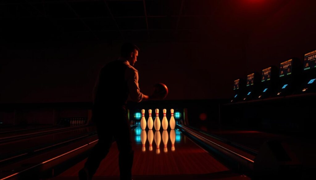 A silhouetted man bowling in a dimly lit alley, aiming at glowing pins.